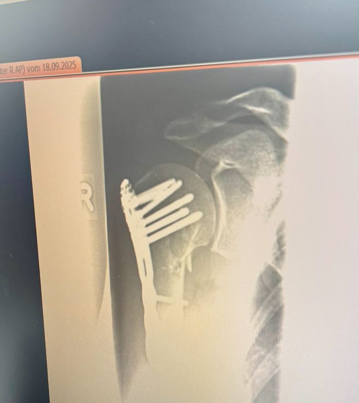bei einem Unfall habe ich mir den Oberarm gebrochen und musste ins Krankenhaus.